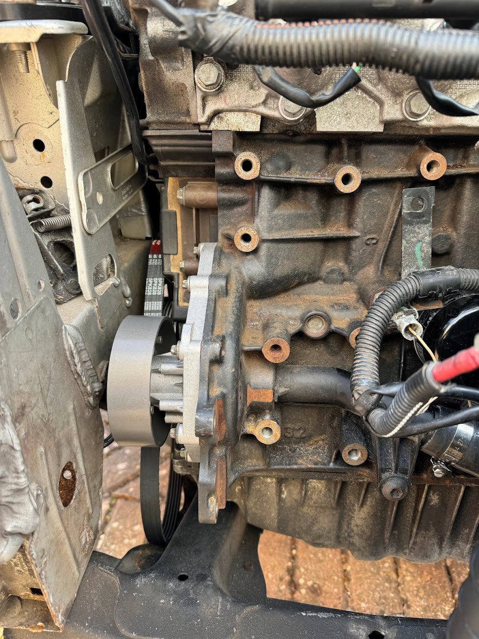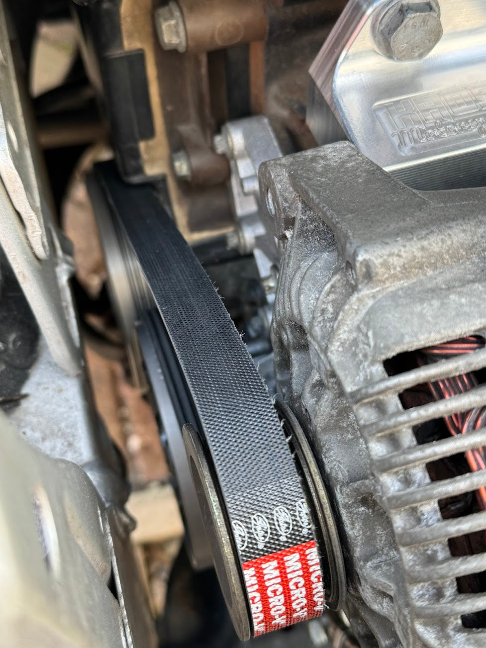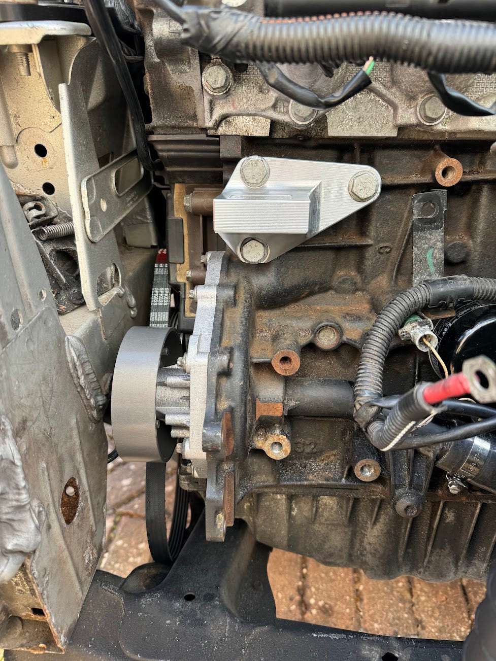 Please ensure there are no existing brackets still on the engine. This includes the power steering pump bracket and the original alternator bracket.