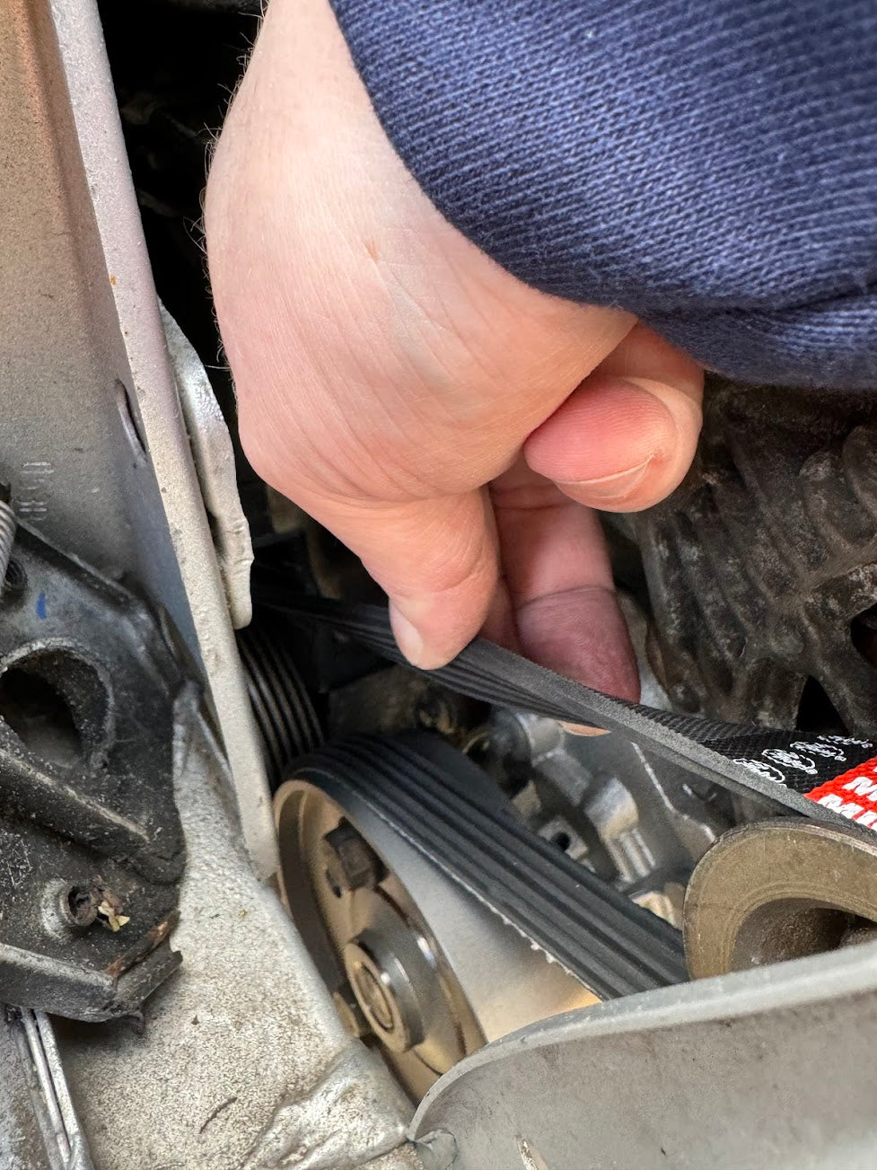 Feed the belt onto the crank pulley first, wrapping the belt up over the water pump and then forward and around the alternator pulley.