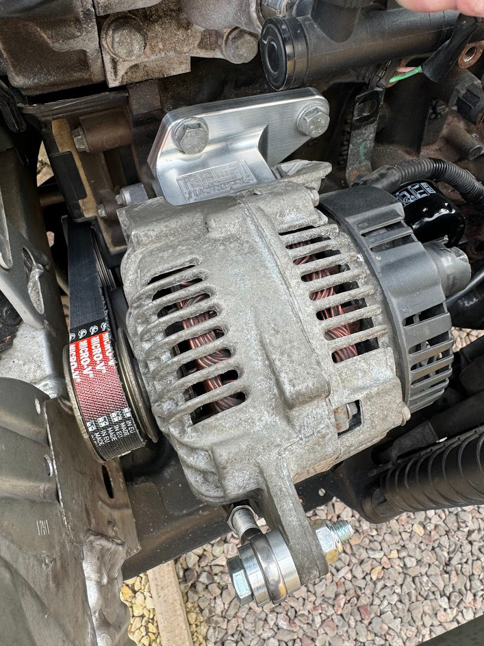 Mount the alternator onto the new KAOS Motorsport bracket and use the existing alternator bolt to secure it in place.